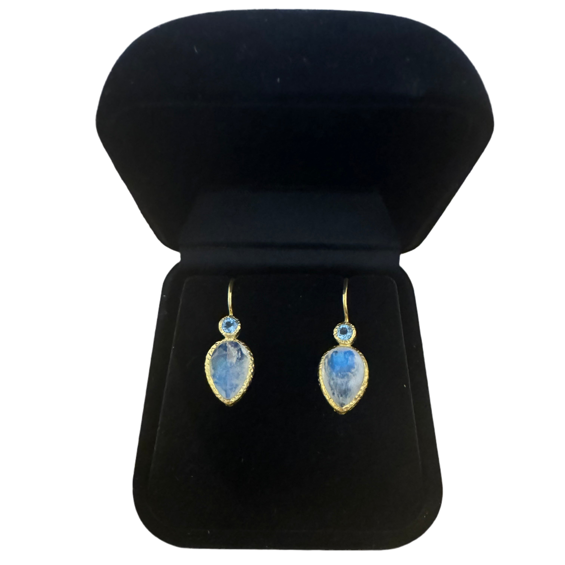 The Celestia Drop Earrings are crafted for the girl who’s building her dream life under a full moon. Featuring a radiant pear-cut natural moonstone framed in warm gold, and topped with a dazzling blue topaz, these earrings bring the perfect energy combo: intuition, clarity, and that little bit of main character magic.